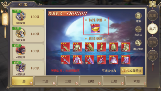 3.从打宝图标可以进入巢穴,每一层的BOSS首次击杀后就可以获得首杀元宝奖励。 巢穴地图一共7层,合计可以拿到1100元宝的首杀奖励。
