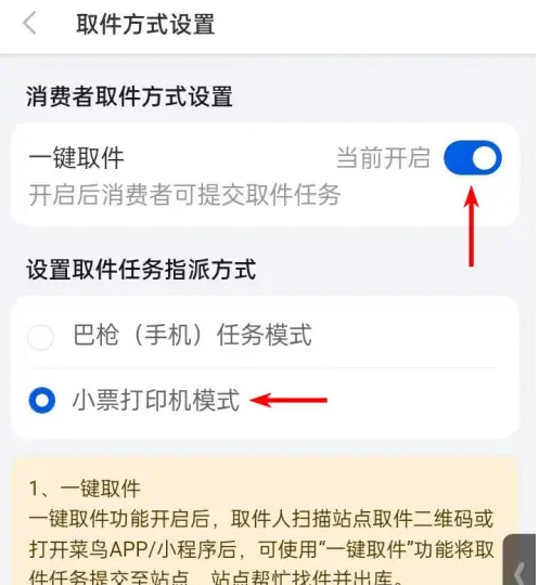 进入到取件方式设置后,先将一键取件功能打开,然后选择小票打印机模式,操作完成后点击保存。