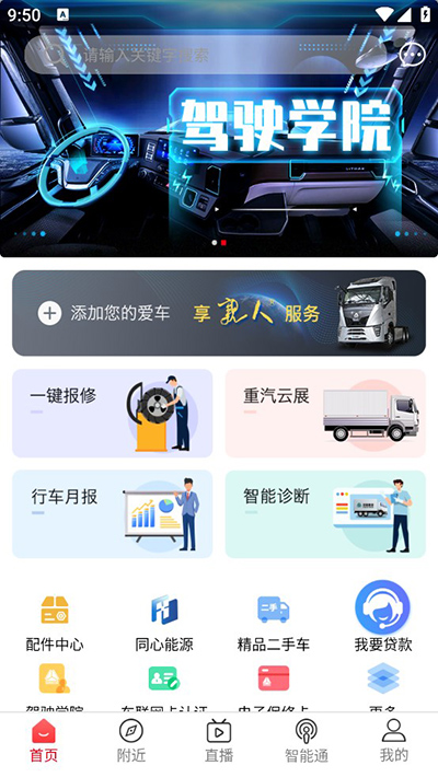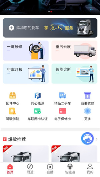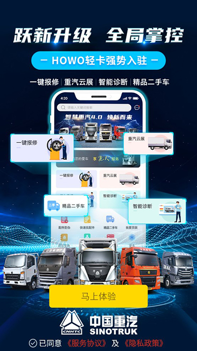 3、业务查询:【首页】四大板块,一键报修,重汽云展,行车月报,智能诊断。