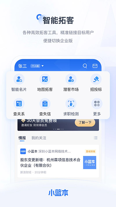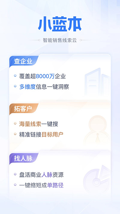 小蓝本企业查询app采用最先进的搜索技术,用户可以在搜索功能中,输入公司名称、公司老板来定位到该公司。此外输入公司名、人名、备案号、社会信用代码还可以查询失信人或失信公司。除此之外软件还可以帮用户制作名片,只需要完成个人信息,即可快速定制。有需要的朋友快来下载软件使用吧。
