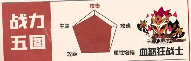 最后是t0的前排角色,这个角色叫做血怒狂战士,可以说是前排也可以说是输出,主要是这两点上来看他都不弱,他可以说是一个比较标准的六边形展示了,他的属性基本是是满了,生命、攻击、攻击距离、攻速和增幅基本上都是满格,他在实战中会消耗自己的血量增加自己的攻击力,这个眨一下看感觉不强,确实单看这一个技能效果他不像一个战士前排,为什么他是前排主要是看他第二个效果,在消耗血量之后他的第二个效果就会发动,发动之后会获得一个生命恢复的buff,这个恢复值是大于消耗值的,这就很恐怖了,他可以在无损的状态下无限叠加攻击,在面具共鸣后,他还会解锁一个新的被动,这个被动效果可以让他在每次受伤之后都可以提升很多攻击力,这一套技能链下来叠加的攻击是非常吓人的,可以说在目前环境里,还没有任何一个阵容敢和他打后期。