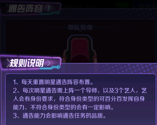 1.每次明星通告需上阵一个导师,以及3个艺人,艺人会有身份要求,符合身份类型的可百分比发挥自身能力,不符合身份的类型会影响自身能力