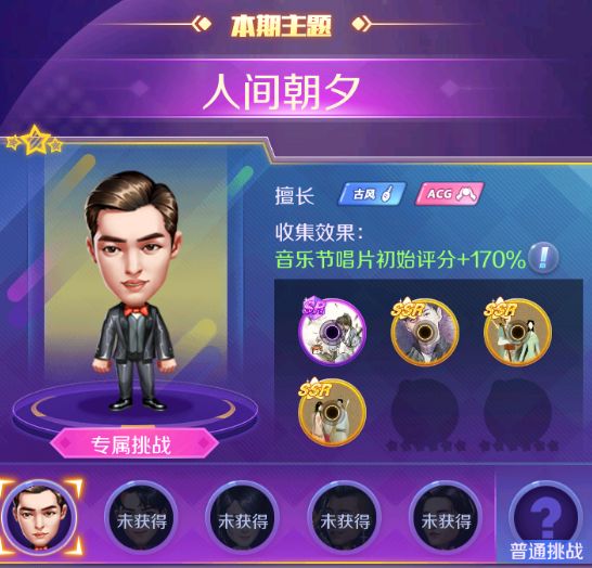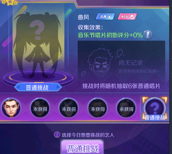 当没有符合主题的艺人时候,只能选择普通挑战,普通挑战没有唱片初始评分加成,出现可以录制的唱片,也是适合主题曲风的普通唱片,所以,让我们多收集艺人,多收集唱片
