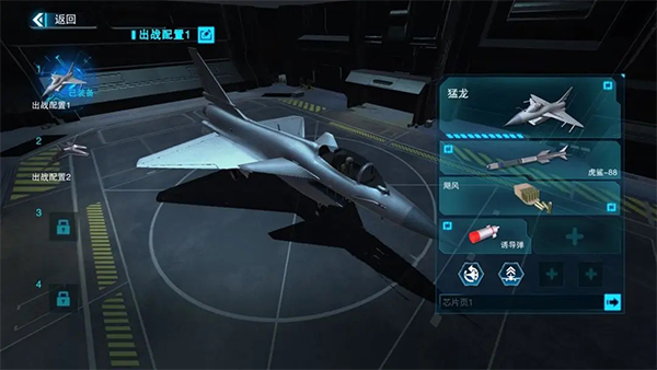 进入“出战”页面,你可以对战机、导弹、机炮、特殊武器和机动动作进行选择和替换,以适应不同的战斗需求。