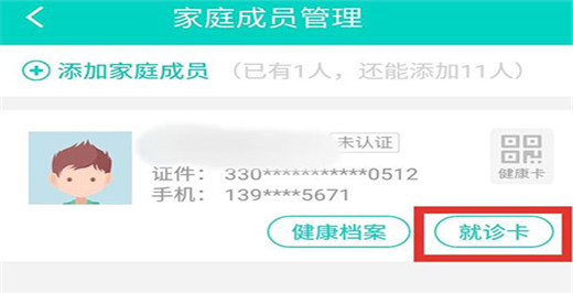 2、进入家庭成员管理页面,在成员栏目的右下角有一个就诊卡选项,通过它可以绑定就诊卡,同时还能绑定每一个家庭成员的就诊卡。