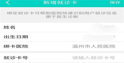 3、点击就诊卡按钮之后,先要选择一个自己有就诊卡的医院,选择完毕之后确认自己的姓名和生日,再输入医院的就诊卡号,最后点击保存即可绑定完成。