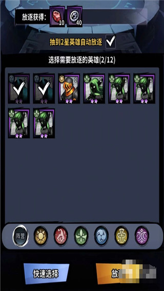 2、还有一种方法是在营地的命运法阵中,在法阵中玩家可以对英雄进行进化、重生、放逐、回退的操作。其中放逐也是对二星英雄的分解。玩家也可以在该界面设置抽到2星英雄自动放逐,也会获得道具材料。