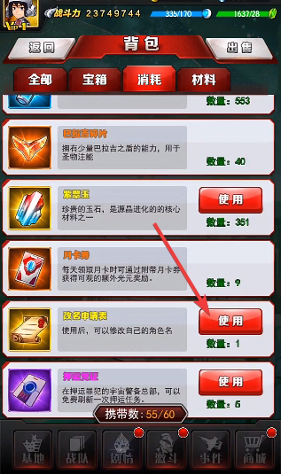 2.购买礼包后在背包中找到【改名申请表】点击使用