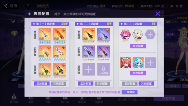 跨服竞技场中每位玩家可配置三套武装阵容以及三套宠物和奥义阵容,三套武装阵容不可上阵重复武装,宠物和奥义可重复上阵