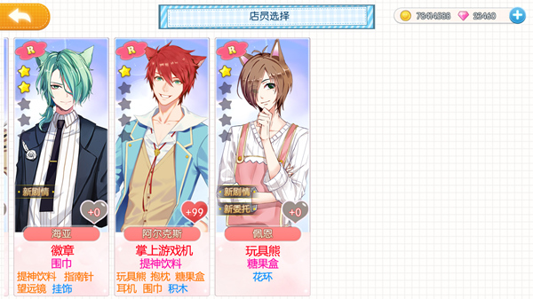 萌猫物语游戏中目前一共有24种礼物,其中12种普通礼物(蓝色边框),12种高级礼物(紫色边框),每个猫男都有一种最喜爱的礼物,送对的话好感蹭蹭涨。当然也有他们各自比较无感的东西,送不对哪怕是高级礼物也效果平平不用心,下面就为各位店长奉上送礼指南,再也不用担心好不容易得到一个高级礼物送出后却收获一个礼貌微笑这种尴尬发生啦。