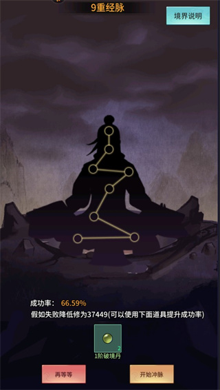 角色修为足够后可以选择破境,有一定的概率突破失败,失败则会降低自身修为