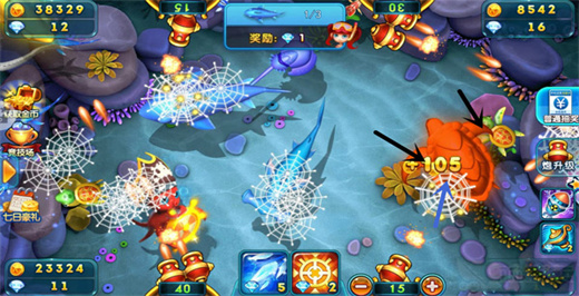 1、攻打慢鱼游得很慢的鱼,其实就是送分鱼,对于这类在你眼前悠哉悠哉游过去的鱼,赶紧调整好炮台方向发起攻击。这类鱼一般有乌龟、比目鱼、魔鬼鱼等,看到在你面前游过,绝不能放过。