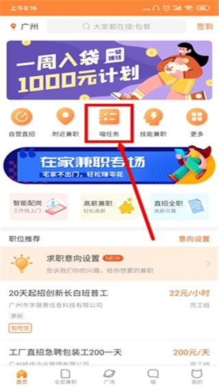 除了一些短工兼职之外,其实还是有一些能帮助我们额外赚钱的小任务的,这个就是喵任务了,那么这个喵任务又在哪里呢?我们打开软件,在求职招聘的主界面的最上方,我们就能够看到喵任务了。
