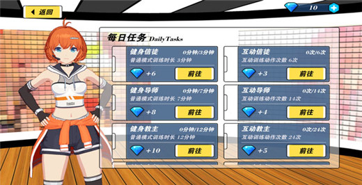 1、全新的角色模型,新增了3个教练和6套服装,相比于1版本有了大大的提高。2、真正的老婆养成系统,玩家可以操作游戏中的角色健身来完成任务,解锁不同的服装,动作等。