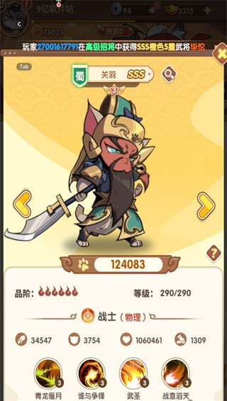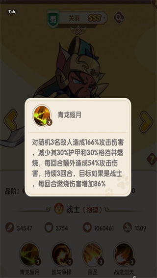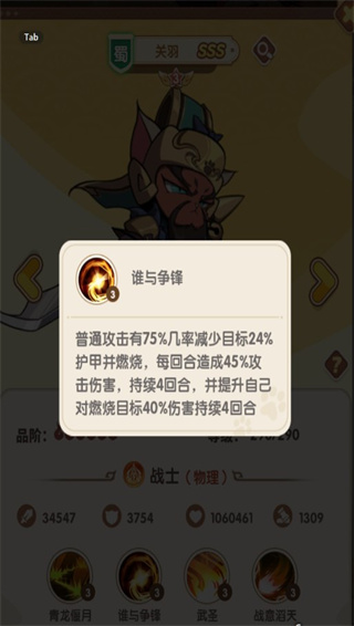 4、三技能作为传统增加攻击生命属性的技能小编就不再赘述,下面讲解四技能战意滔天,这个技能直接给关羽赋予的反击机制,挨打还能直接给大方造成十分不错的反击伤害,配合对敌燃烧效果增伤,关羽即时在自己回合外也能提供非常不错的输出,能抗能打,不愧为武圣是也,抽到关羽的小伙伴快养成起来吧。