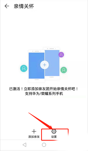1、点击设置进入华为亲情关怀主页,点击设置按钮,进入设置。