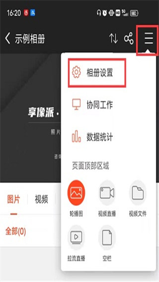 2)点击右上角更多设置图标,点击【相册设置】