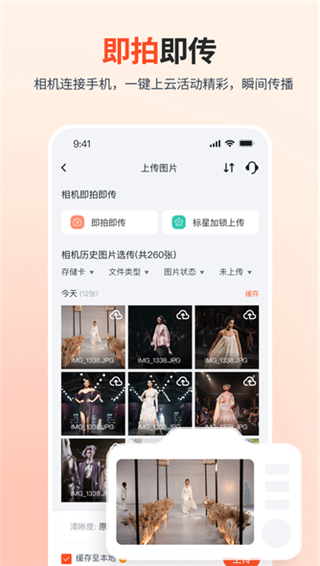 1、即拍即传:支持通过数据线(需要OTG转接头)或Wifi(需要相机具备Wifi功能)连接相机,摄影师按下快门,照片即可通过App上传到专属云相册2、即传即修:每个相册都有专属修图码(可选),后端修图师通过享像派的PS/LR插件直连云相册修图。