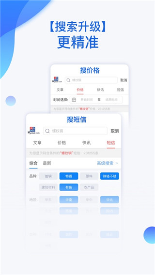 1、价格:最全面、权威、即时的钢材、有色金属、炉料、农产品、等大宗商品市场价格。2、资讯:资讯直播功能,即时了解行业消息;丰富精彩的资讯文章、权威深刻的分析报告。