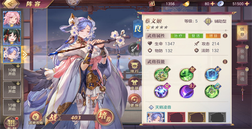7、武将将有各自的属性和技能特点,如蔡文姬擅长为队友回复