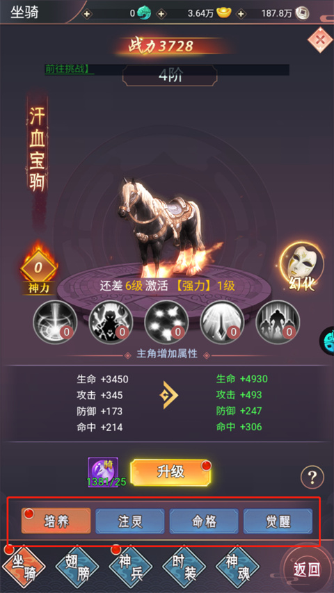 3、下方我们可以看到4种升级方式,比如培养、注灵、命格、觉醒等等;