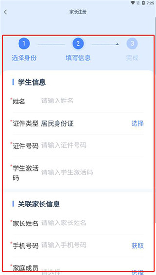 3、然后完善需要填写的信息,比如学生的信息:姓名、证件号码、激活码,还有家长的信息,然后点击下一步就能激活啦!