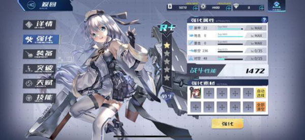 之后是我们的强化功能,这个功能相信小伙伴们都不会陌生吧,有所不同的是在佛晓里我们不是强化舰灵的等级,而是强化他的属性值,我们通过吞噬素材卡来获取他们的属性强化到需要强化的舰灵身上,需要注意的是每个舰灵自身的属性都不相同,有些属性是为0,是无法进行强化的,所以你们一定要确认好自己舰灵需要的属性,选择对应属性值高的素材卡来进行强化,才能避免浪费。