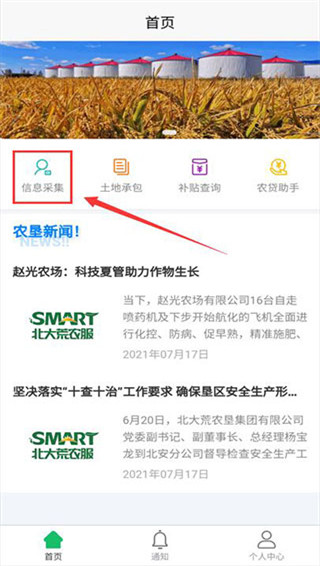 1、首先我们在本站下载安装并打开北大荒农服,然后点击软件首页的信息采集按钮。