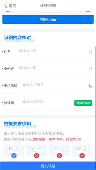 4、如果识别信息有误可以手动更改,手机号码默认是你的登录手机,接着获取验证码并填写,最后点击最下方的“提交认证”按钮即可。
