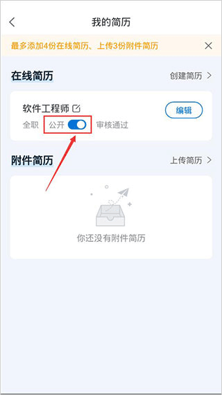 3、然后点击简历卡片上的【开关】按钮,即可将公开状态切换为屏蔽状态。
