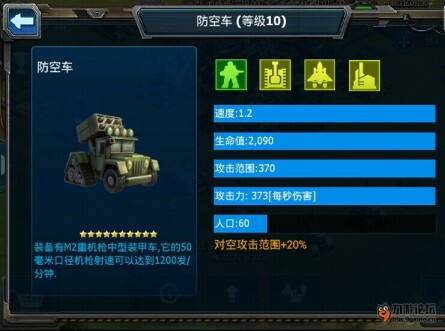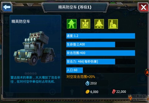 防空车可以说是在防空中不可或缺的一环啦,攻击范围比机枪塔要远,攻击力也不小,可以对机枪塔防御上不足的补充,可以说是会移动的机枪塔。当然最好是设置成防御状态,不然很容易被引出去干掉。升级精英也同样要得到解锁卡后才行,一样也只有在限时商店或有可能跨服战才能得到,但需要的绿币同样也是不少的。所以基本上多数人都只有普通防空车,但将防空车布防在碉堡及炮塔周围,这夜莺来了,也是会怕怕的。