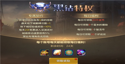 累积充值300点券,即可开启黑钻特权,关键的BUFF有获得更多的经验值和可以学习比自身高5级的技能。另外每天还可以领取金币、雷米的援助、复活币和炉岩炭。