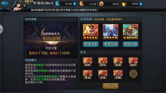 2、进入轮回试炼关卡之前,玩家可以调整英雄与经文,进入之后则无法修改。
