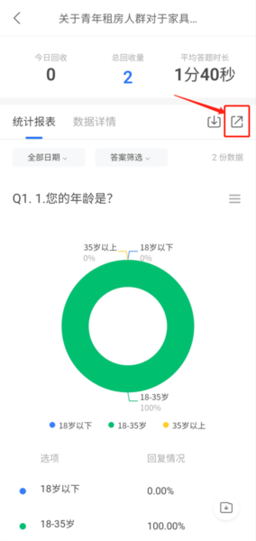 1、在问卷网app中进入数据报表页面后,可以选择下载文件内容与类型,也可以点击右上方“分享”按钮,把数据报表共享给他人