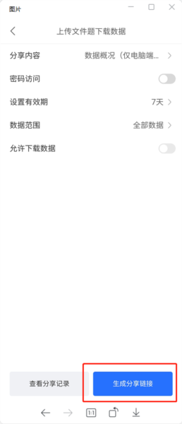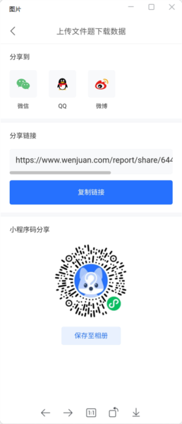 2、设置您需要分享的内容、数据范围与是否采用密码保护后,点击“生成分享链接”,选择您要分享的平台,目前支持微信、QQ、微博等渠道,您也可以通过生成小程序或复制链接进行分享。