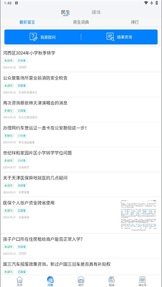 2、点击下方导航栏问政,用户首先能看到天津人民提交的相关民生问题以及官方回复,用户也能点击上方我要提问,就能像官方提交自己的问题,官方回复后可以点击结果查询来查看回复的信息。