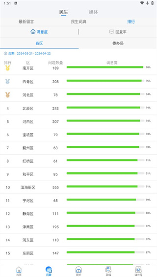 4、点击上方排行,用户可以查看天津各地区回复问题数量以及满意度,同时也能看到天津各委办局排名。