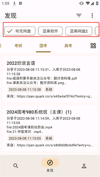 4、导入完成后返回发现界面就可以看到导入的资源了,你可以在上方分类中切换资源