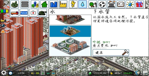 4、左上角状态栏。锤子图样是建造。柱形图是需求,柱子越高,说明需求量大,通过观察柱形图可以针对性建造三大基本区域。推车是铲除,铲除建筑和区域和水管是分开的(防止误伤),操作和建造一样。眼睛是视图界面,在视图界面你可以清楚看到区域被影响的情况,对症下药快速查看对应视图的方法,例如你想看环境视图,随便点开一个公园,就会看到类似建筑还有影响范围,如果是原谅色,那就是满足了,红色的话,那就是红色警戒了。感叹号是紧急情况用,如果你的建筑着火了,可以在这里点报火警标记在着火地方,消防车很快就到(抱鲸同)+/-号是快速查看全图满足的总百分比的。