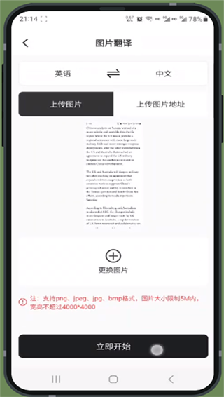 图片中的文字翻译成对应语言,支持拍照翻译,相册图片翻译,网络图片翻译。翻译结果可直接储存为新图片