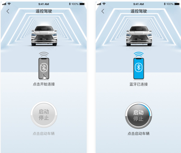 1、点击遥控驾驶,蓝牙未连接时,点击连接蓝牙;蓝牙已连接,车辆未启动时,点击启动车辆。