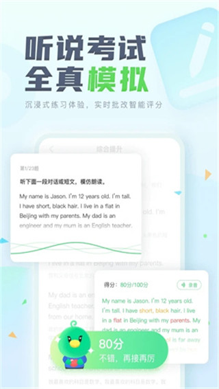 另外,e听说中学app还有各种词汇、作文阅读、音标学习、趣味配音等,支持用户断句模仿跟读和实时进行测评,可以帮助用户更好的进行英语口语的表达能力。非常有意思的是该app内还有语音评测技术和手写作文批改评分功能,能够及时的了解用户的不足之处,并根据用户的弱项进行有针对性的练习,帮助用户轻松高效率的学好英语。有需要的用户快来下载体验一下吧。