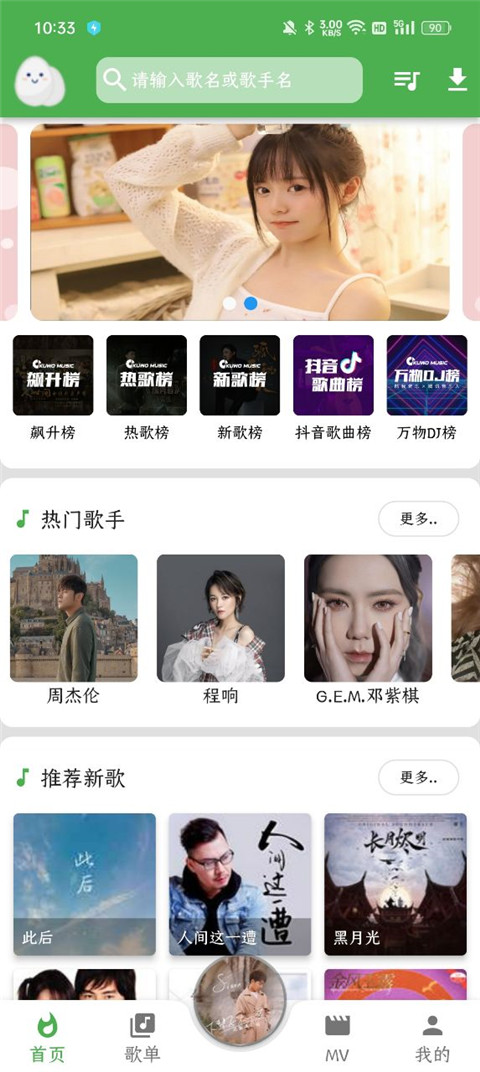 1、下载并安装软件后,进入首页不用注册登录,在首页这里有热门歌手和新歌推荐,有飙升榜,热歌榜,新歌榜,抖音歌曲榜,万物DJ榜等等各种榜单推荐,