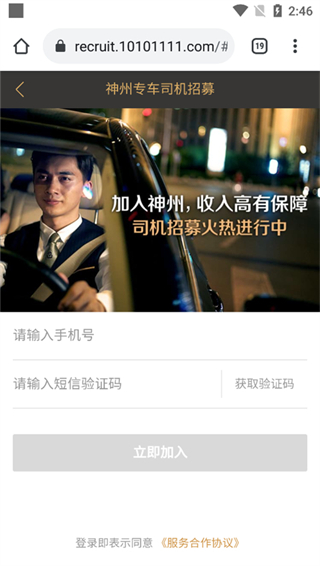5、输入自己的手机号和验证码,点击立即加入,报名信息通过审核后,收到面试短信,司机持身份证及驾照原件到面试地点参加面试即可。