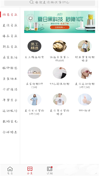 除了首页的类别,还可以通过界面下方的“分类”选项选择更加细致的小类别,而且,在推荐专区,详细列出了不同折扣力度的类别,以更好的进行挑选。