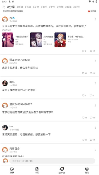 5、点击下方漫广场,你可以看到漫友最新发布的动态,用户们可以在这里分享和谈论。