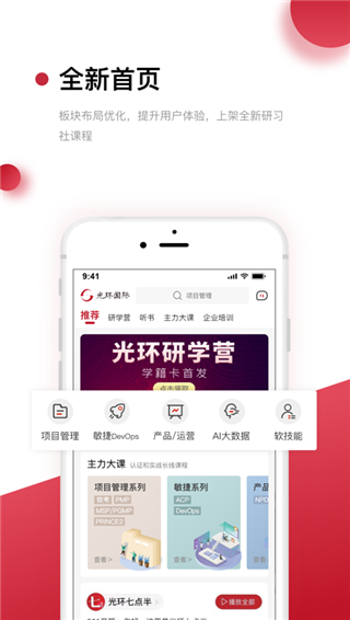 光环云课堂app是一款在线辅导学习应用软件,该软件内拥有大量丰富的课程学习教材,有企业管理、就业培训等,并且还有项目管理学院、敏捷学院、产品经理学院、大数据学院、人工智能学院、DevOps学院,六大学院来助力你的职业技能发展。