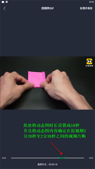 3、在打开的新页面底部的进度条中,用户可以左右两侧移动进度指针来设置动态图的时间以及其图片内容,之后单击右上角【处理并保存】