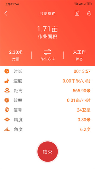 4、农机作业人员可设定设备宽幅、行走方式(逐行,跨行或画圈模式)、作业单价等,在作业中实时取得精确作业信息(行走距离、作业速度、作业面积等);