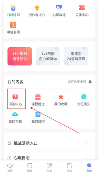 首先我们打开软件点击【我的】,来到我们的个人信息界面,在这个界面我们点击中间菜单栏里面的【问答中心】。